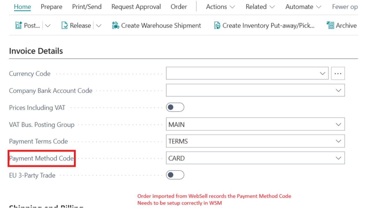 Orders imported from Websell record the Payment Method Code in Business Central. This code must also be correctly configured in Webstore Manager to ensure proper payment handling.
