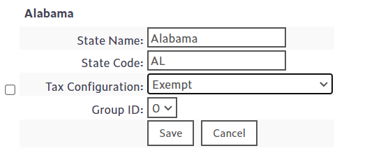 For each state where sales tax should not be charged, select Tax Exempt from the Tax Configuration dropdown and save.