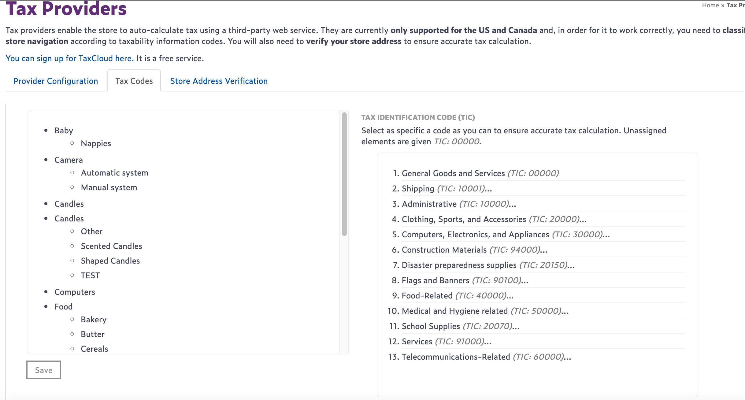 3. Having saved your configuration, you’ll now need to set Tax Identification Codes (TICs) for your items. Clicking the Tax Codes tab, you’ll see your store’s navigation on the left and the available tax codes on the right.